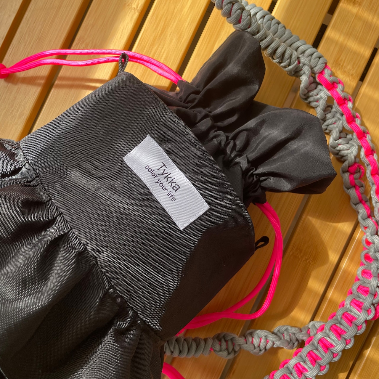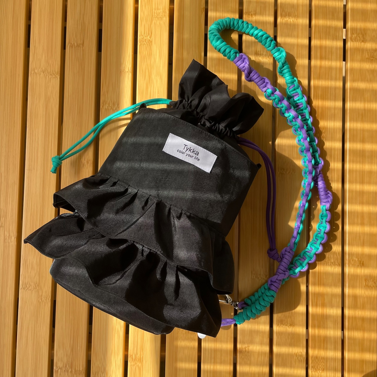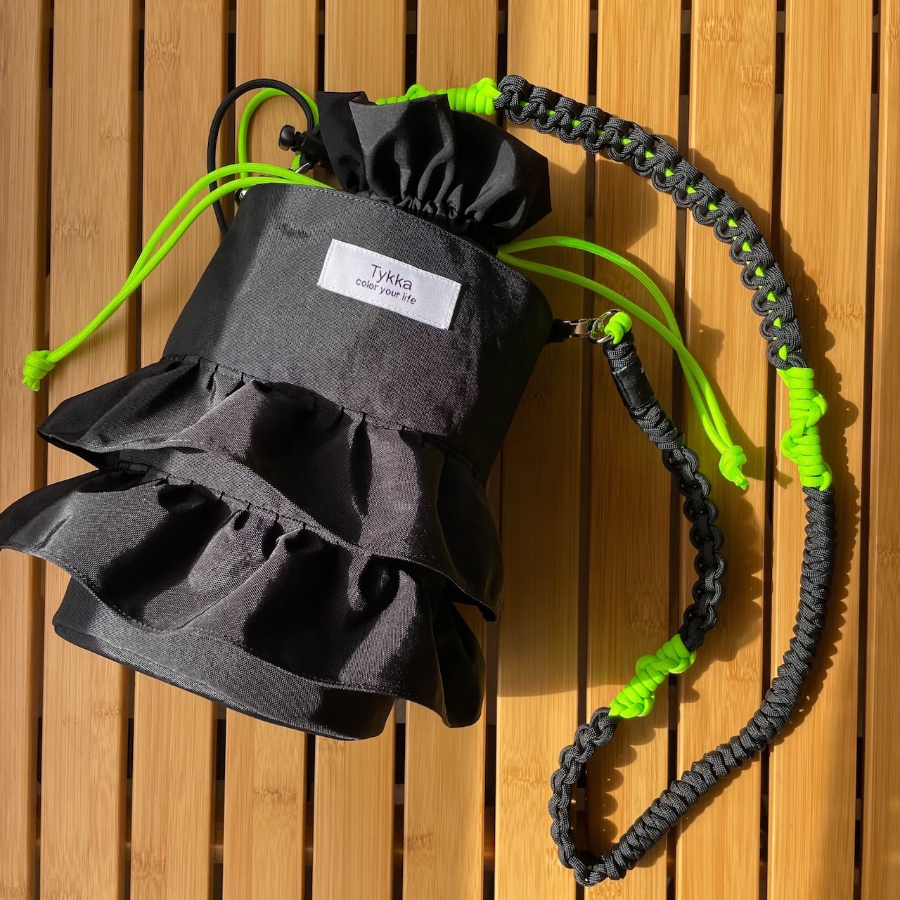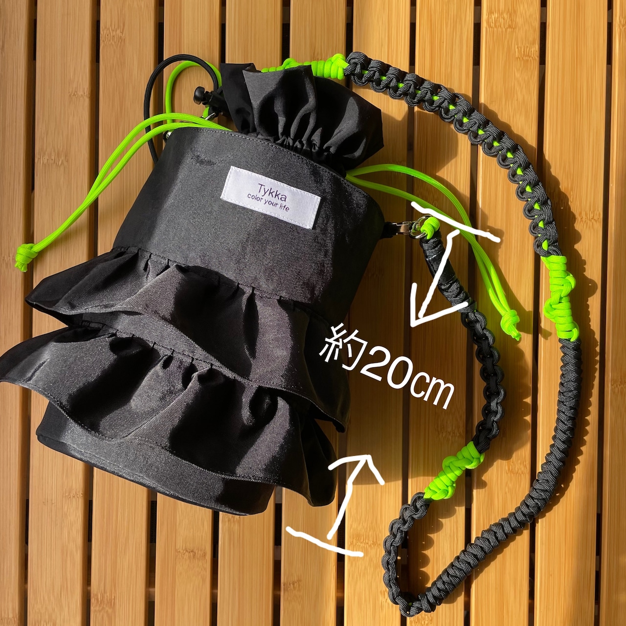撥水加工ナイロン生地を使った、ショルダー巾着バックです。フリルをたっぷりつけて可愛いながらも、甘くなりすぎず、どんなファッションにも合わせやすいショルダー巾着バッグができました。カラフルなパラコードがコーデに彩りを与えてくれます!おでかけやショッピングがウキウキ楽しくなるはず!